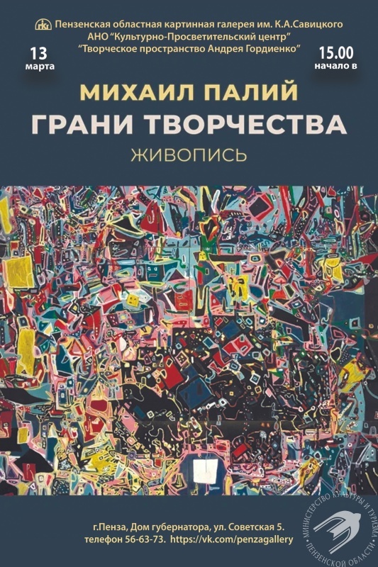 В Губернаторском доме состоится открытие персональной выставки «Грани творчества» члена монументальной секции Московского Союза художников, известного российского абстракциониста Михаила Палия. В экспозиции будут показаны знаковые работы мастера в жанре живописи.