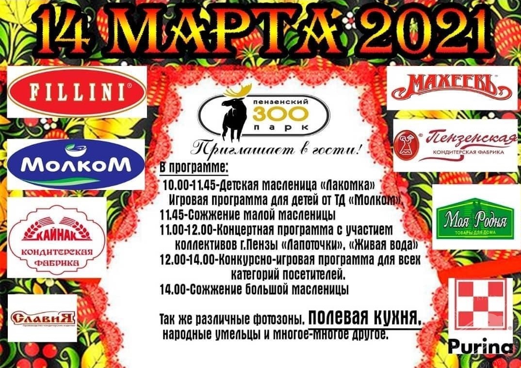 Главной площадкой празднования Широкой Масленицы станет парк Белинского. Для гостей выступят творческие коллективы Пензы, на аллеях парка расположится масленичная ярмарка и фотозоны. Одно из излюбленных развлечений горожан — покорение столба с петухом на верхушке — состоится в 11:30. Завершится гулянье масленичной дискотекой. А сожжение чучела назначено на 19.00.