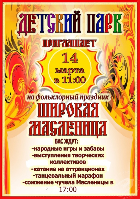 С весельем, шумом, песнями, блинами и с захватывающими развлечениями на любой вкус встретить Масленицу приглашает парк «Комсомольский». В программе: соревнования в поднятии гири, армрестлинг, снегоступы, масленичный столб, катание на лошадях, продовольственная и ремесленная ярмарки, праздничная концертная программа, сожжение чучела Масленицы.