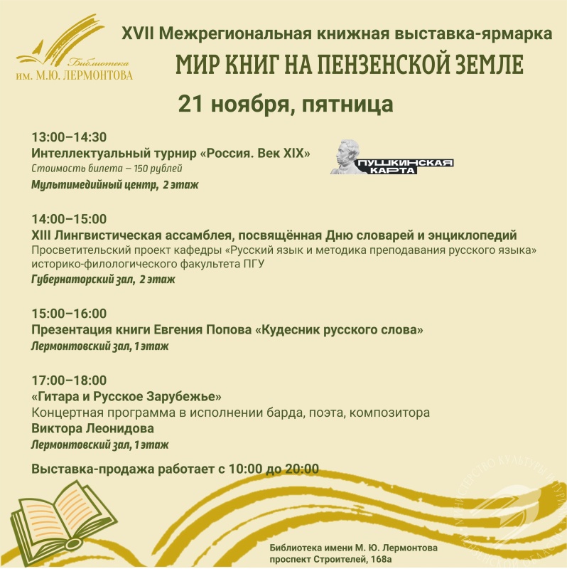 /С 20 по 22 ноября 2025 года в Пензенской областной библиотеке имени М.Ю. Лермонтова пройдёт XVII Межрегиональная книжная выставка-ярмарка «Мир книг на Пензенской земле»