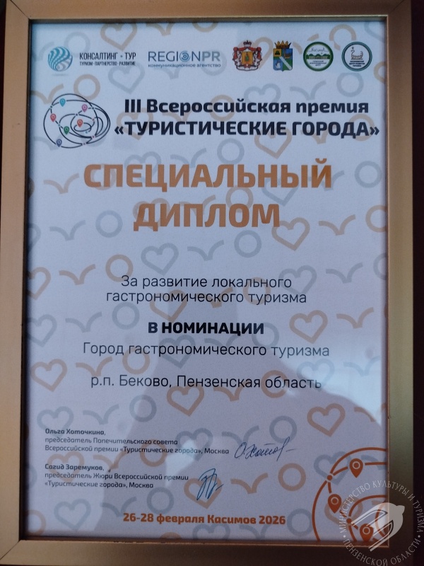 Туристско-информационный центр Бековского района достойно представил Пензенскую область в конкурсе III Всероссийской премии «Туристические города», где оценивалось 387 проектов из 70 регионов нашей страны. Беково отмечено специальным дипломом «За развитие локального гастрономического туризма».