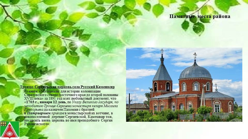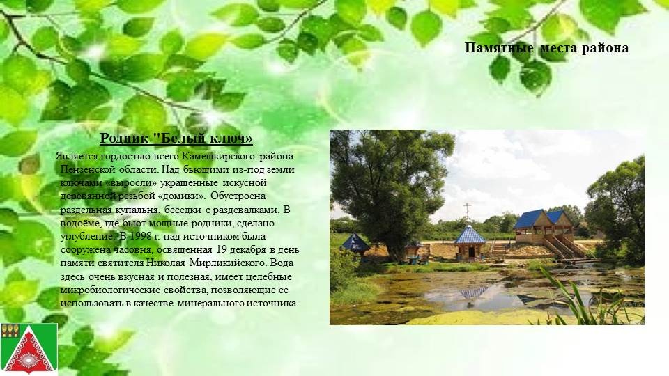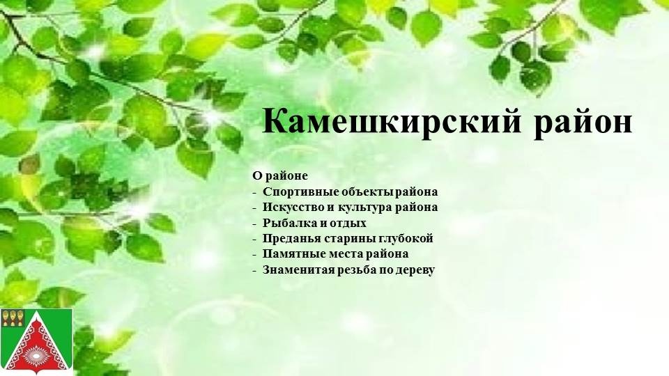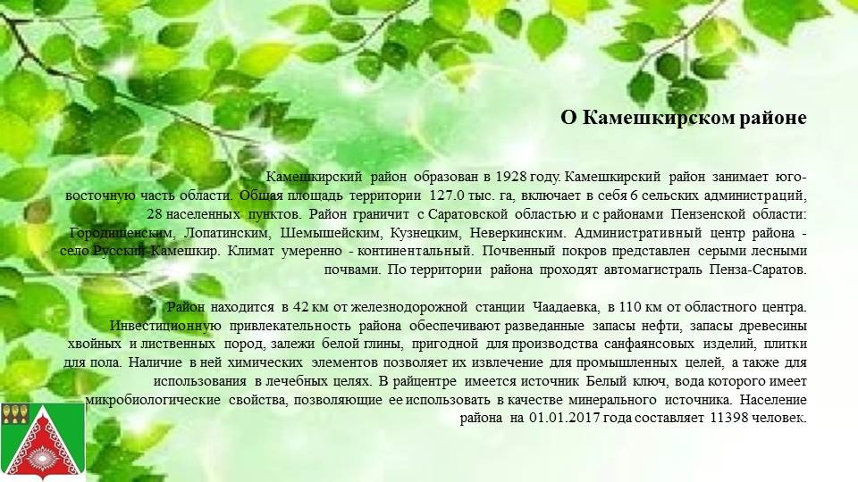 Камешкирский район образован в 1928 году. Камешкирский район занимает юго-восточную часть области. Общая площадь территории 127.0 тыс. га, включает в себя 6 сельских администраций, 28 населенных пунктов. Район граничит с Саратовской областью и с районами Пензенской области: Городищенским, Лопатинским, Шемышейским, Кузнецким, Неверкинским. Административный центр района - село Русский Камешкир. Климат умеренно - континентальный. Почвенный покров представлен серыми лесными почвами. По территории района проходят автомагистраль Пенза-Саратов.