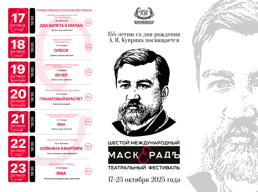 В этом году фестиваль посвящен 155-летию Александра Ивановича Куприна, а в его афише — не только инсценировки купринских произведений, но и другие спектакли, так или иначе связанные с этой темой. Посетить все постановки можно по программе «Пушкинская карта», которая с 2025 года реализуется в рамках национального проекта «Семья».