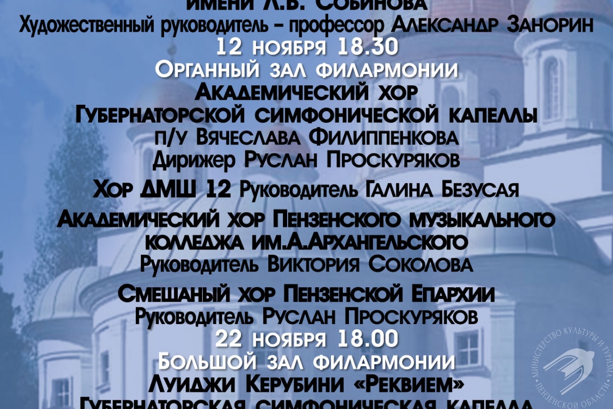12 ноября в Органном зале филармонии в рамках фествиаля выступят пензенские хоровые коллективы: академический хор Губернаторской симфонической капеллы п/у Вячеслава Филиппенкова (дирижёр — Руслан Проскуряков); хор ДМШ № 12 (руководитель — Галина Безусая); академический хор Пензенского колледжа им. А.А. Архангельского (руководитель — Виктория Соколова); смешанный хор Пензенской епархии (руководитель — Руслан Проскуряков).